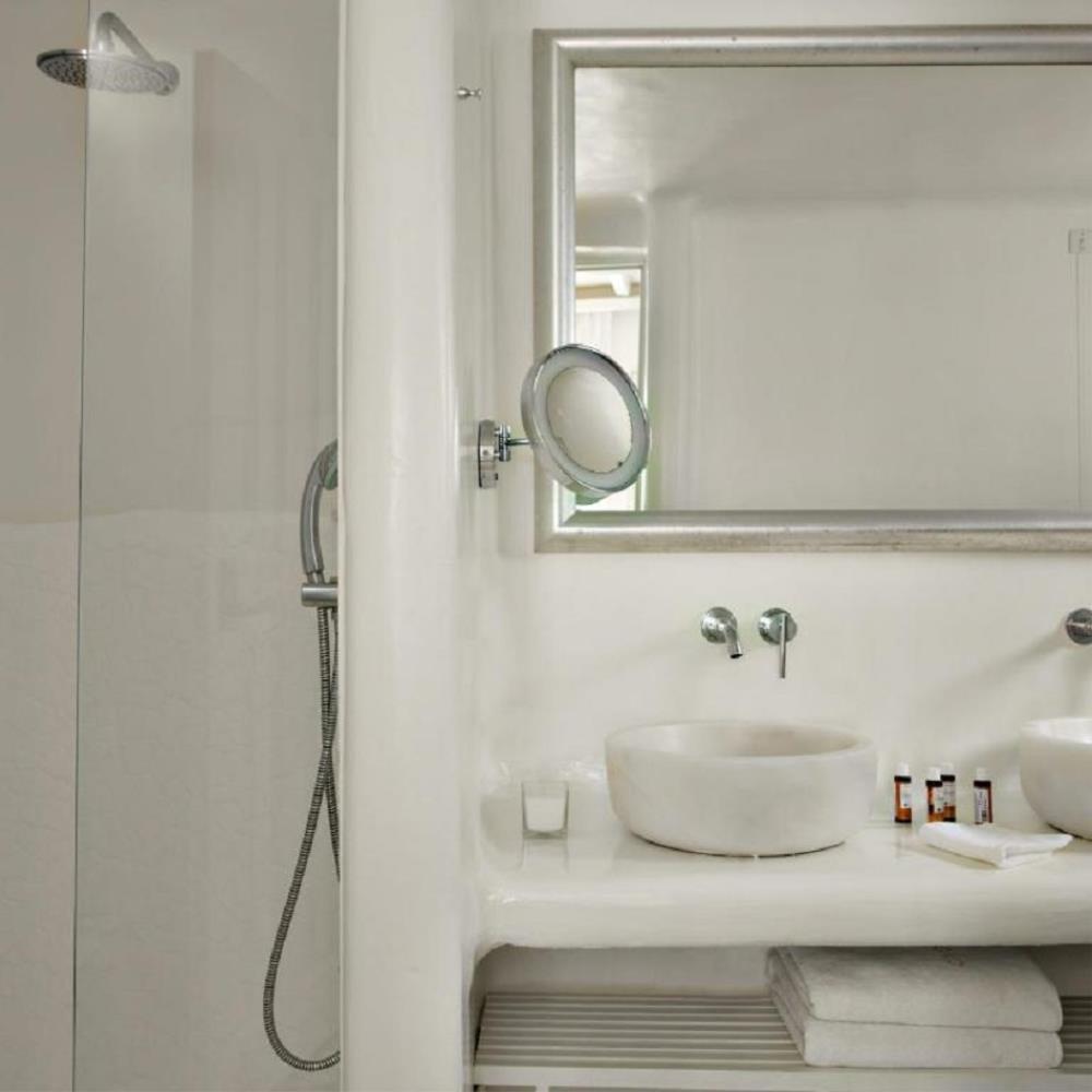 The grace of gold and the purity of white add a feeling of luxurious bliss into the atmosphere inviting guests to succumb to the pleasures of cosmopolitan island living. The premium room features a double bedroom with a queen size bed in an open plan setting allowing travelers to relax in an opulent haven of serenity and repose while gazing at the cerulean Aegean.