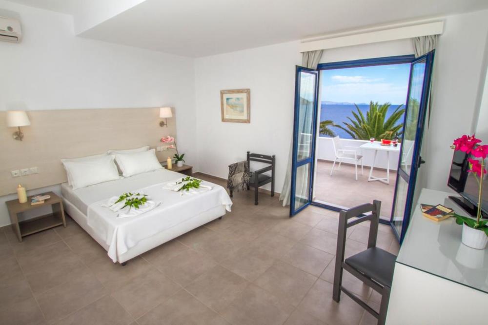 The hotel is built amphitheatrically on a peninsula of distinctive natural beauty between the bays of Mononaftis and Psaromoura, forming a unique panoramic view of the Mediterranean Sea. The hotel offers direct access to three different beaches ideal for swimming and snorkeling due to their protection from the frequent northeastern winds that regularly affect the North of Crete.
