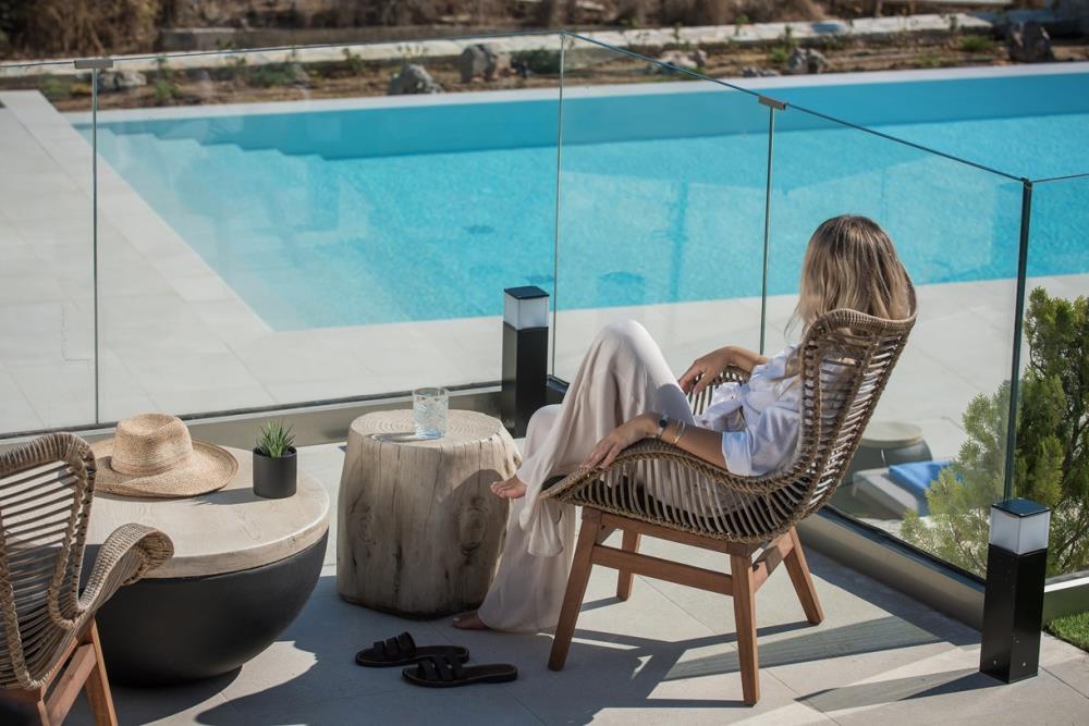 Out of respect for the natural surroundings and in total harmony with it the combination of stone and wood makes Irida a special place where the eye meets the deep blue of the sky and the sea.