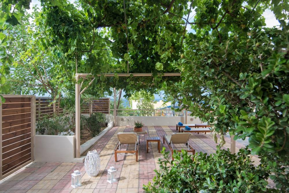 The two-storey 45 m2 Irida Gardens Maisonette can accommodate up to 4 adults and is ideal for couples and friends who want to enjoy luxury living in a private heaven. A spacious bedroom with a shower cabin, a separate living area with a sofa bed, a private bathroom and a kitchenette ensure a luxuriously comfortable stay. The luxury offered in this Maisonette is completed by a private balcony of 30 m2 with sea view and comes with a table, chairs and sun loungers. Guests also have access to all the facilities at Irida Hotel Apartments. ( Breakfast, All day Restaurant & Bars, 2 Swimming Pools etc).