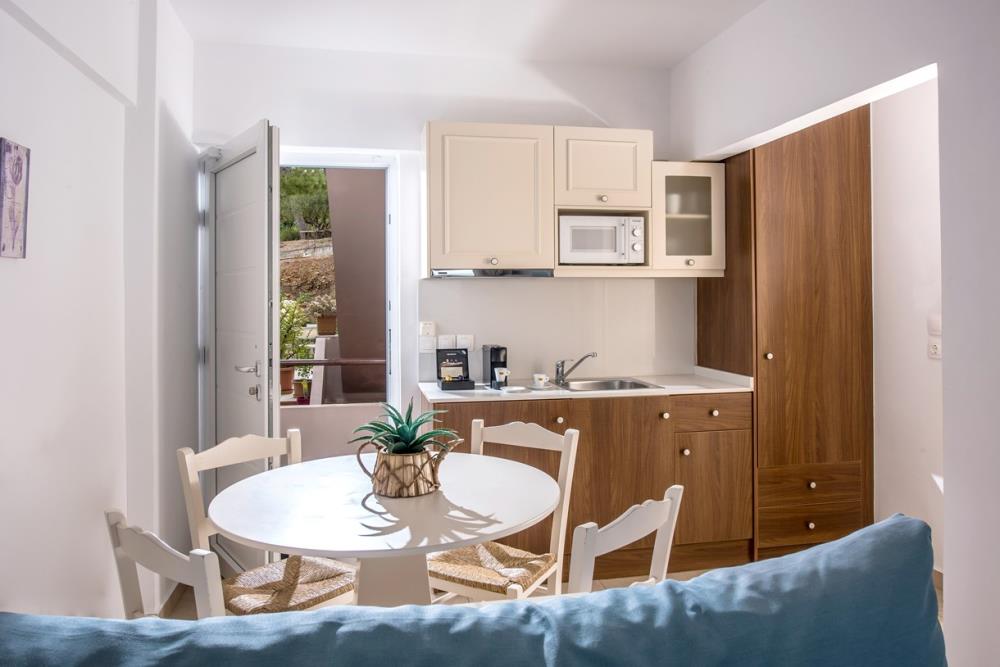 The 25 m2 Irida Gardens Studios offer contemporary design and comfort and can accommodate up to 2 adults or even 3 with the addition of a guest bed. Luxuriously spacious, consisting of a bedroom, a private bathroom and a kitchenette with all the necessary amenities, they ensure a comfortable stay. A private terrace of over 40 m2 with side sea view while overlooking a beautiful garden comes with a table, chairs and sun loungers completing the luxury offered in this studio. Guests also have access to all the facilities at Irida Hotel Apartments (Breakfast, All day Restaurant & Bars, 2 Swimming Pools etc.).