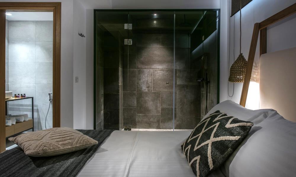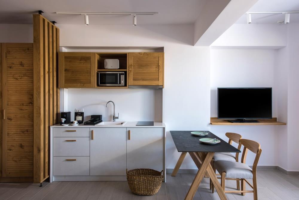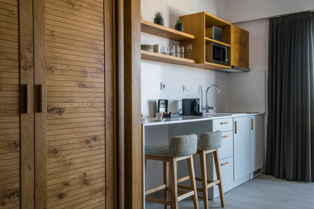 The 40-45 m2 Deluxe Apartments Sea View offer exceptional luxury and comfort to our guests. They are spacious and fully functional with all the necessary amenities. Elegant in style and architecture, they can accommodate up to 4 adults. A spacious bedroom with a shower cabin, a separate living area with a sofa bed and dining corner, a private bathroom and a kitchenette with all the necessary amenities, ensure a luxuriously comfortable stay. Their contemporary design has floor-to-ceiling windows offering view to the pool and the sea complemented by a private terrace which comes with a furnished sitting area.