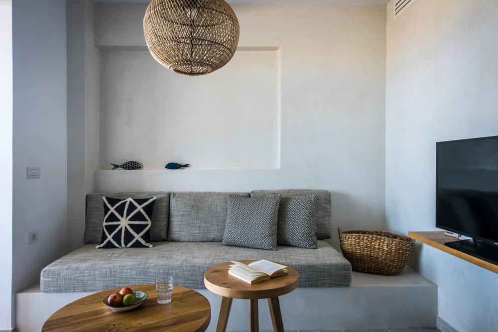 The 30-35 m2 Apartments Pool View of elegant design can accommodate up to 4 adults. A separate bedroom and living area with two sofas and a dining corner ensure a most comfortable stay. Fully functional, they come with a private bathroom and a kitchenette with all the necessary amenities. All apartments are on pool level with view to the sea, have direct access to the pool and come with a terrace complete with a coffee table and chairs.